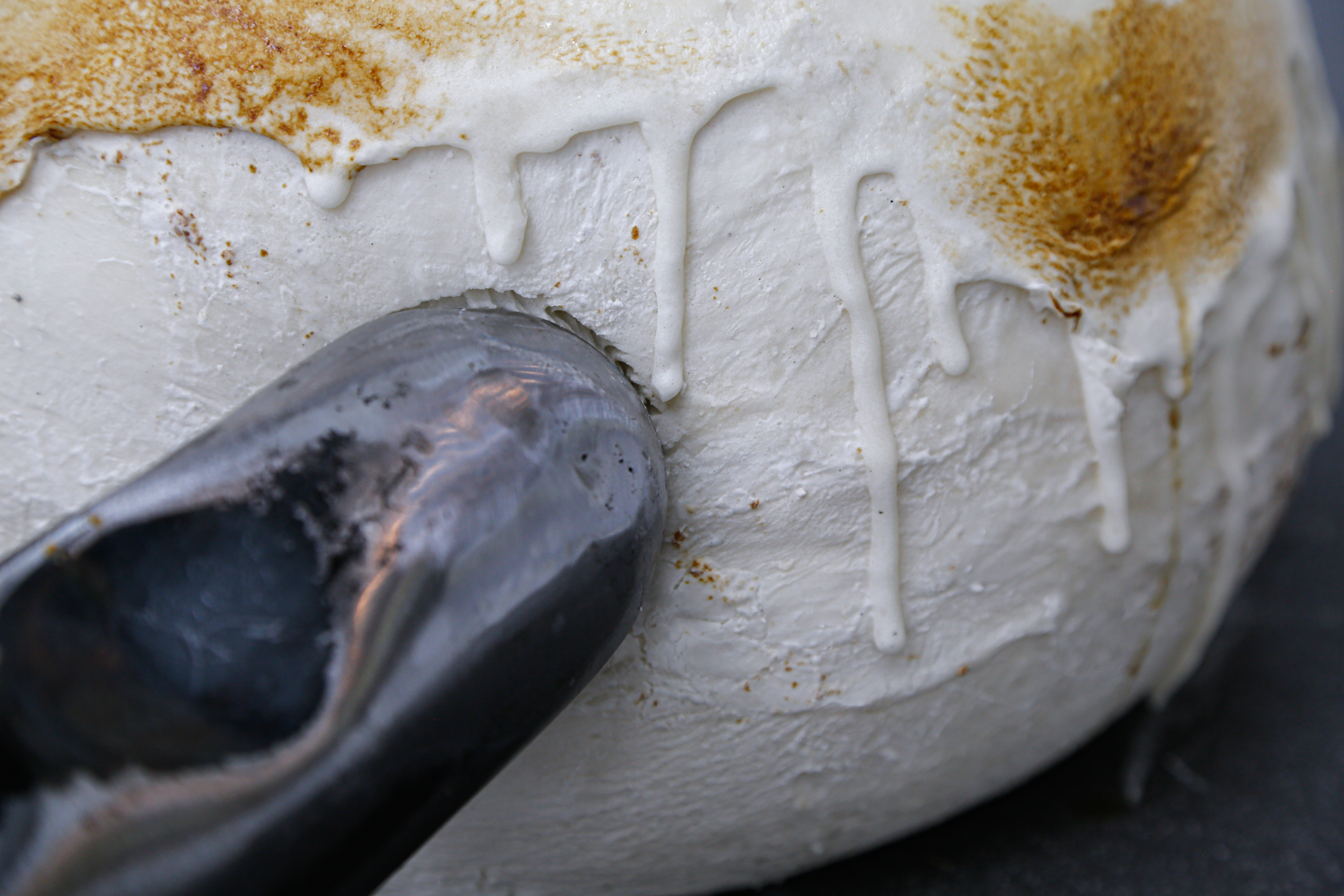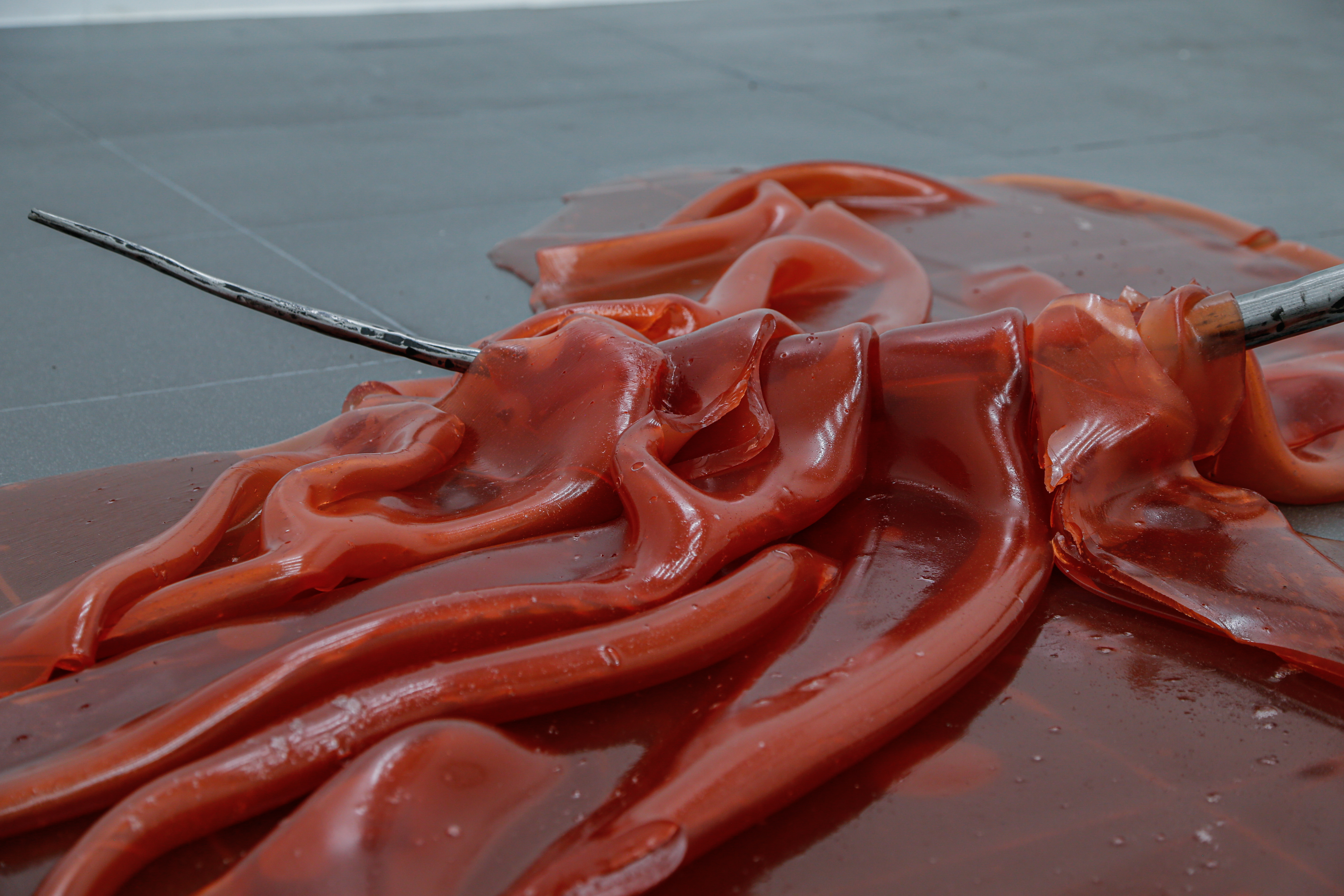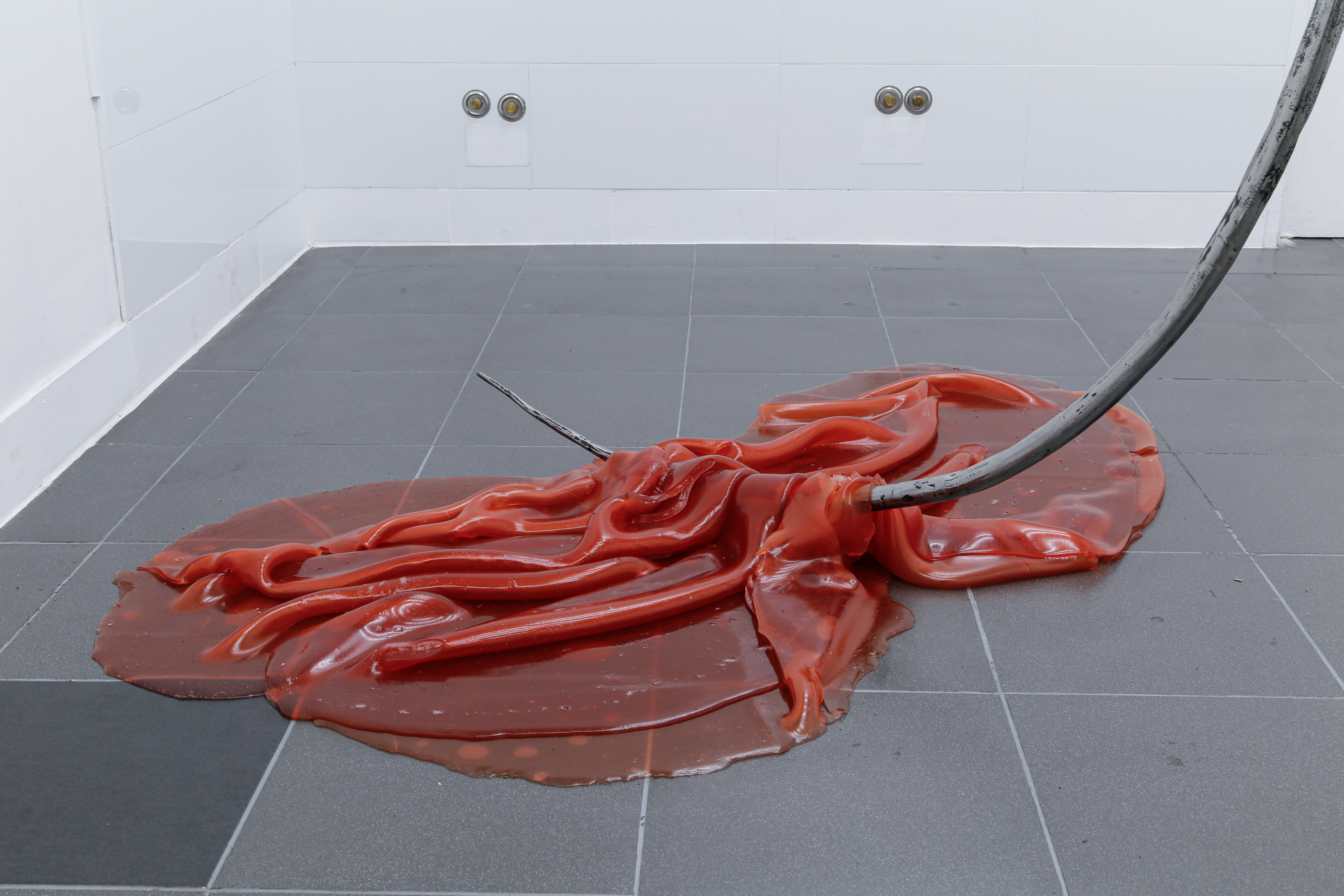 Raspberry gummy, beaten mild steel, marshmallow, marine rope